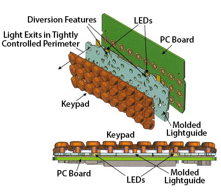 This comparison of Molded Lightguide technology vs. Direct LED backlighting shows how the use of a molded LED lightguide between the PC board and keypad can tightly focus the light as it enters the thru-holes to the keypad, reducing the number of LEDs required.
